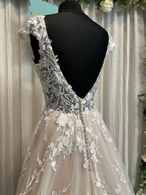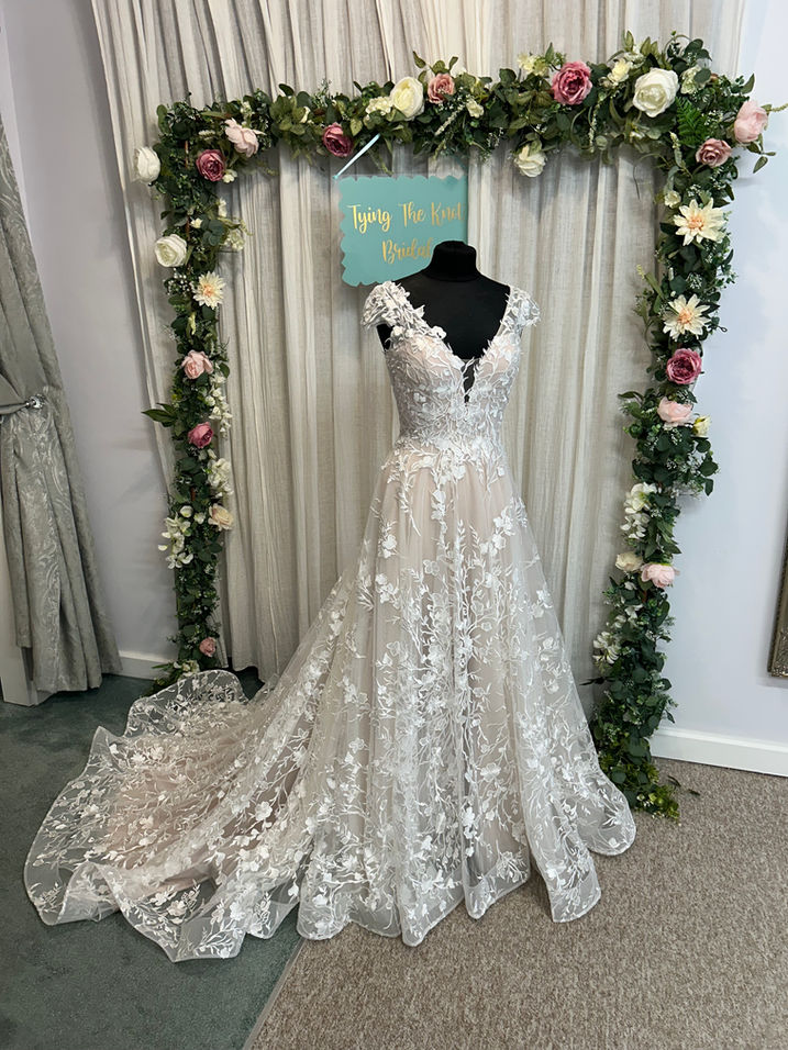 Our sample gown is in the colour mocha ivory by is also available in all ivory.