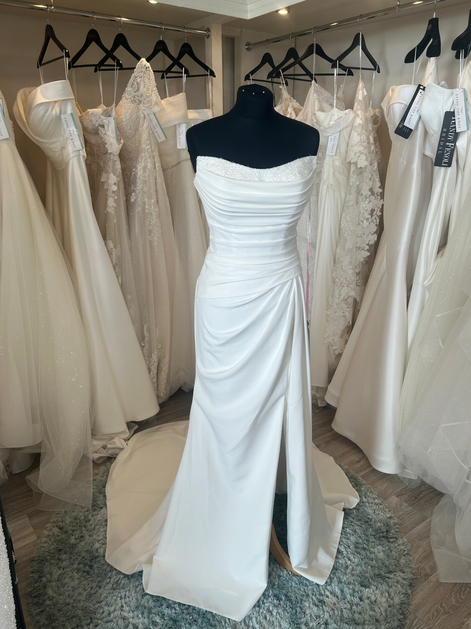 This gown has been designed with a ruched bodice to highlight every curve of your body. A beautiful strapless neckline highlighted with crystal beaded detail.